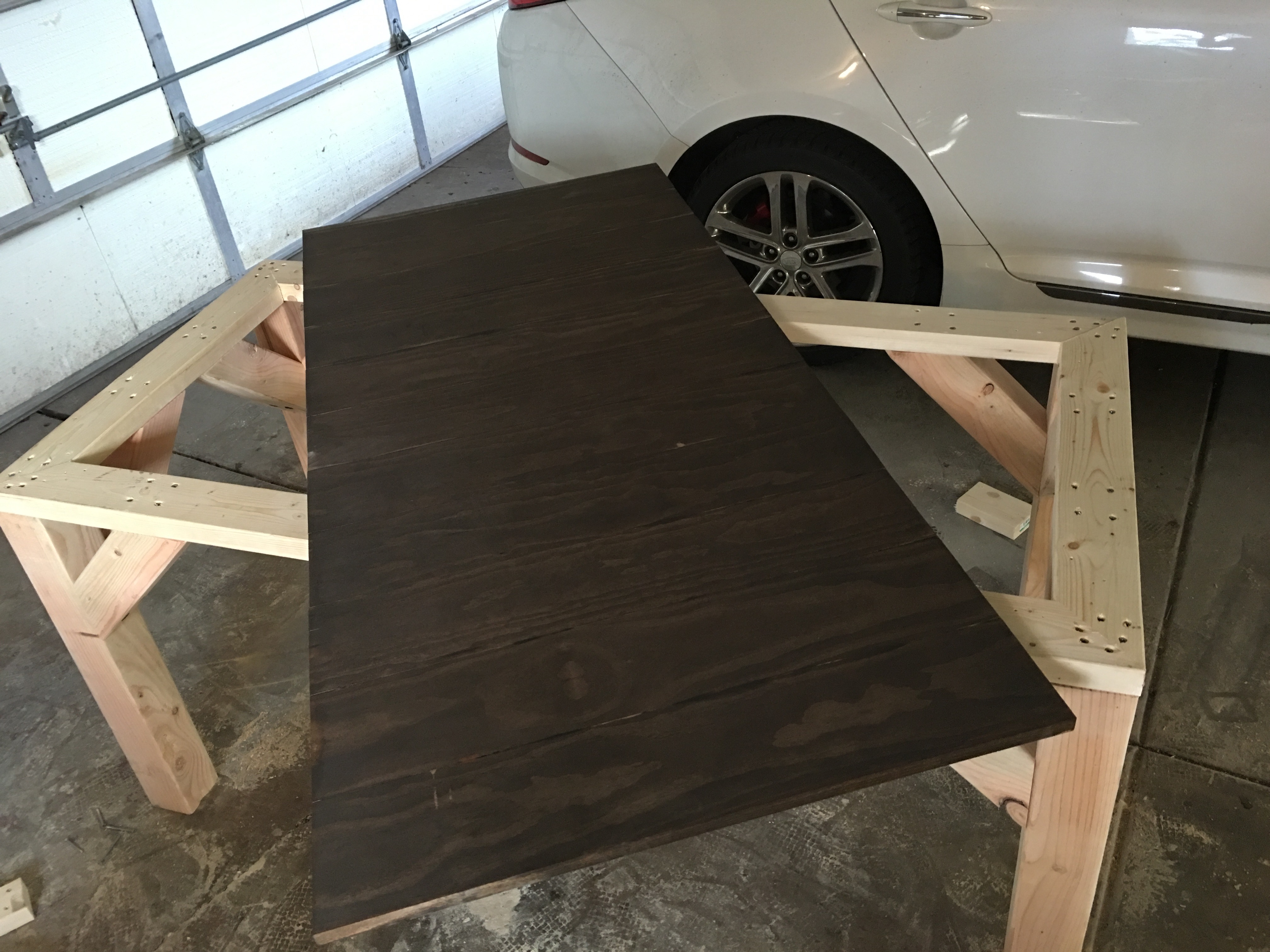 Stained desktop on top of the frame. Huge shoutout to Sarah on this one. I didn’t like the way the wood came out looking with Ipswich Pine stain (very light stain), so I was going to trash this desktop and remake it with different wood. She stained it with a way darker stain (espresso) because it really didn’t matter, since I was just going to throw it out. Long story short I ended up liking it A LOT so I kept it, and made the whole desk espresso!